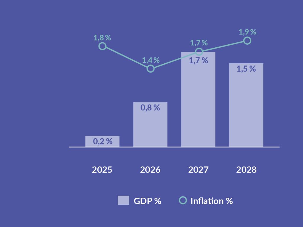 Talouden kasvu jää vuonna 2025 0,2 prosenttiin. Vuonna 2026 kasvu vauhdittuu 0,8 prosenttiin ja seuraavana vuonna 1,7 prosenttiin. Ennustejakson lopulla vuonna 2028 kasvu tasaantuu 1,5 prosenttiin.